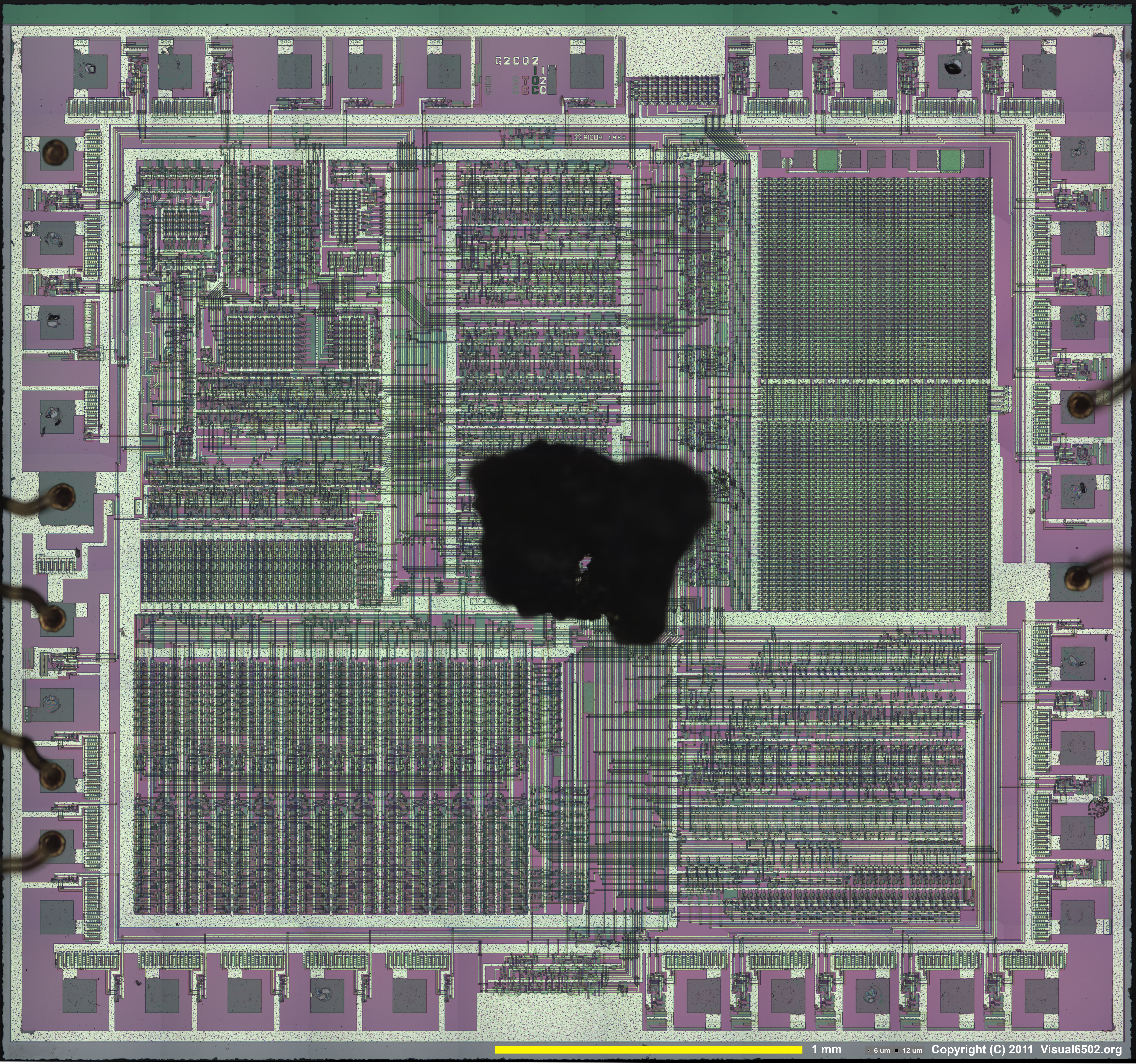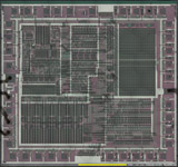 We had small a problem depackaging the 8F1 chip. Part of the plastic package over the center of the die had hardened and didn't come off after our first attempts. The hard spot was probably caused by heat from the chip when it was running. Luckily, we have a pretty good technique for fixing this and getting a clean die, though it often increases erosion of the metal traces. You can see this in our first shot below, as well as the hard plastic spot in the second image.